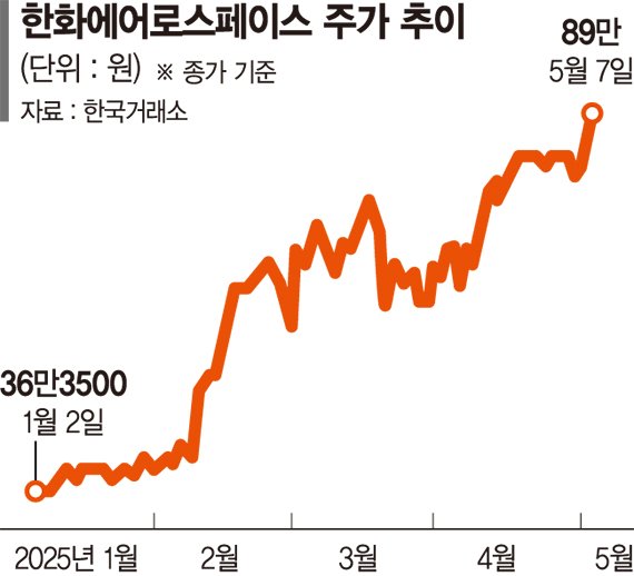 7일 한국거래소에 따르면 이날 한화에어로스페이스는 전 거래일 대비 8.68% 오른 89만원에 신고가 마감했다. 시가총액도 40조원대까지 높아져 현대차를 제치고 5위에 올랐다. LIG넥스원(2.12%)도 장중 한때 34만7000원을 찍어 신고가를 경신했다. 방산주인 현대로템(6.01%), 한국항공우주(3.40%) 등도 전 거래일 대비 상승 마감했다.