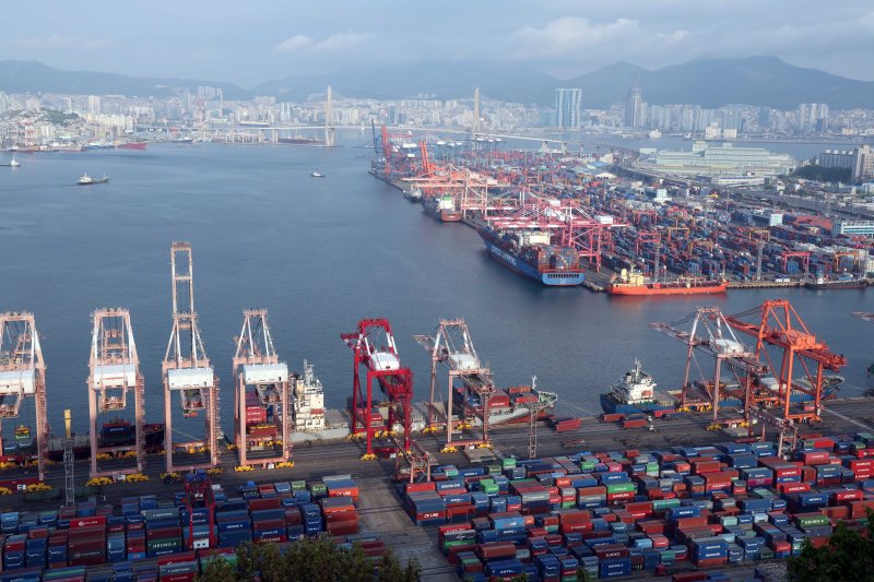 부산 남구 신선대 및 감만 부두 야적장에 수출입 컨테이너가 가득 쌓여 있다. 뉴시스