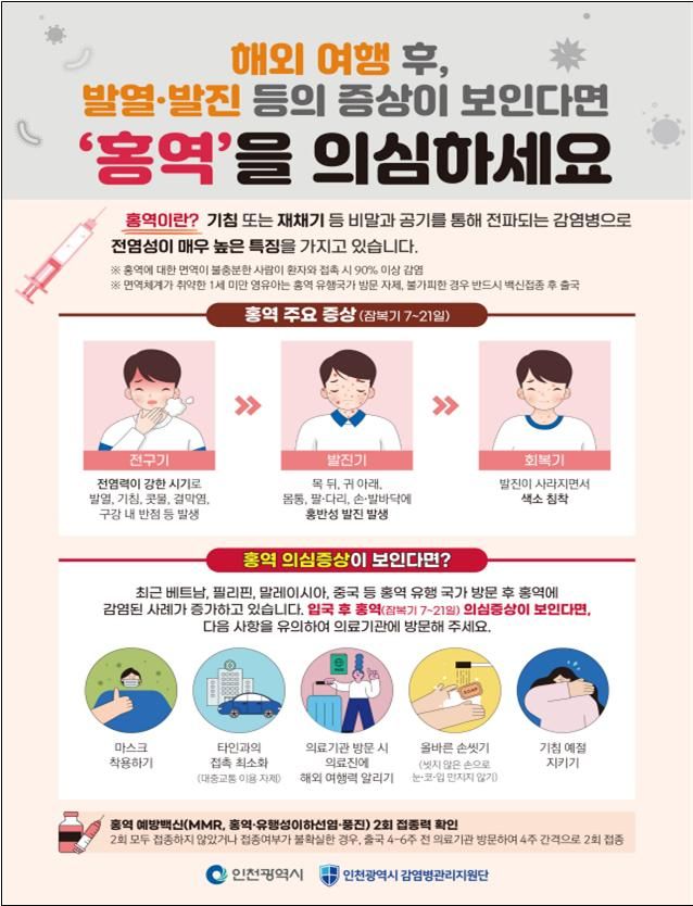 인천시는 시민들에게 홍역 유행 국가 방문 또는 해외여행 후 홍역 의심 증상이 나타날 경우 신속히 의료기관을 방문해 진료를 받고 전파 예방 조치를 해 줄 것을 당부한다고 9일 밝혔다.