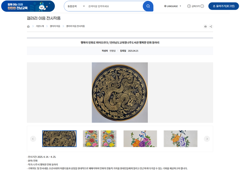 이에 오프라인 전시 공간을 온라인 전시 플랫폼으로 확장하고자 교육청 누리집 내에 '디지털 갤러리 이음'을 개설해 전시 관람의 시간적·공간적 제약을 해소하고, 누구나 언제든지 예술작품을 감상할 수 있도록 접근성을 높였다.