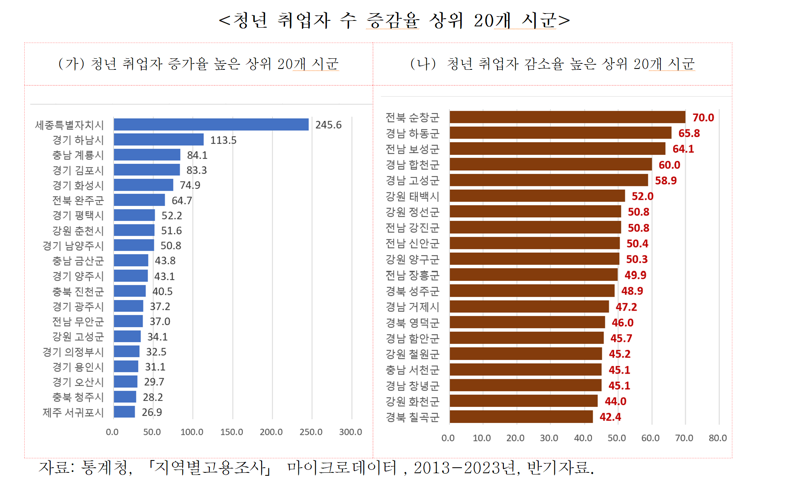 인구소멸위험 지역의 청년층 취업자 감소가 두드러졌다. 조선업 밀집 지역을 포함한 영호남의 산업도시들도 청년고용률이 큰 폭으로 감소했다. 산업 도시들의 쇠퇴로 인해 기존에는 남성 중심의 고용구조를 갖고 있던 광양, 거제, 여수, 영암 등의 여성 고용률이 크게 증가한 점도 주목할 만한 변화다. 그 결과 수도권과 비수도권 간 상대임금 격차도 확대돼 2013년에는 임금이 높은 상위 지역에 비수도권 산업도시들이 8곳이나 포함됐으나 2023년에는 6곳으로 감소했으며, 그나마 상위 10곳 이내에 세종시를 제외하고는 한 곳도 포함되지 않았다.