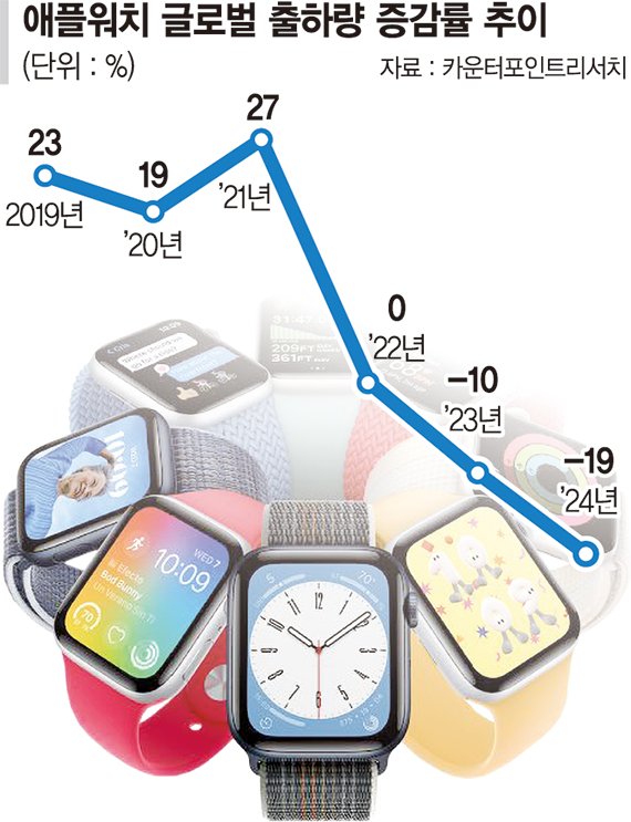 신제품 출시가 지연된 영향도 컸다. 애플의 스마트워치 라인업 중 가장 저렴한 '애플워치 SE' 시리즈는 2년 8개월 전인 지난 2022년 9월 2세대 출시된 게 마지막이다. 애플은 원가 절감을 위해 SE 모델 케이스 소재를 기존 알루미늄에서 플라스틱으로 바꾸는 방안을 추진 중인데, 내부 디자인 부서 반발, 당초 기대보다 낮은 생산단가 절감 효과 등의 문제에 부딪혀 개발에 난항을 겪고 있는 것으로 알려졌다. 애플워치 최고급 라인인 울트라 모델도 2023년 9월 2세대 출시 이후 2년 가까이 신제품이 공개되지 않고 있다.