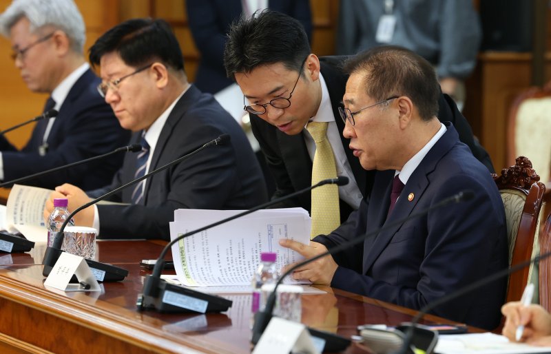 박성재 법무부장관(오른쪽)이 12일 정부서울청사에서 열린 제21대 대통령 선거 대비 공명선거 관계장관회의에서 자료를 살펴보고 있다. /사진=뉴시스