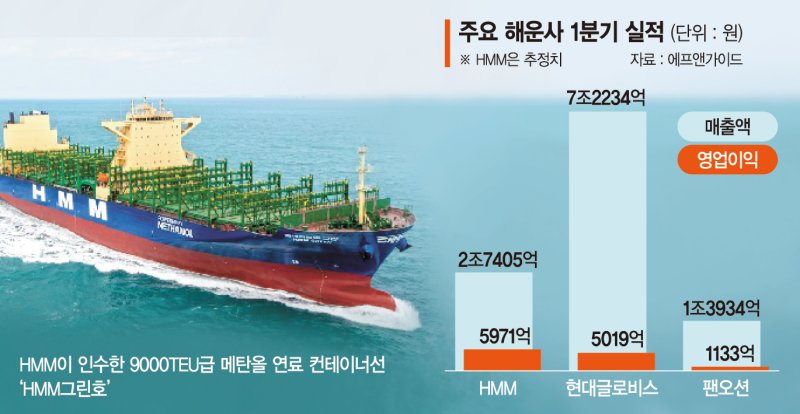 12일 업계에 따르면 올해 국내 해운사들은 1·4분기 견조한 실적을 거뒀다. 현대글로비스는 매출액 7조2234억원, 영업익 5019억원으로 지난해 같은 기간 대비 각각 각각 9.7%, 30.4% 증가했다. 수익성 위주 사업에 집중하며 1분기 기준 역대 최대 실적을 거뒀다. 팬오션도 같은 기간 매출 1조3934억원, 영업이익 1133억원으로 전년 대비 각각 42.8%, 15.4% 증가했다. 국내 최대 컨테이너선사인 HMM은 이번주 실적 발표를 앞두고 있다. 금융정보업체 에프앤가이드에 따르면 HMM의 올 1·4분기 영업이익 컨센서스는 5971억원으로 전년 동기 대비 46.7% 증가할 것으로 추정된다. 매출액도 2조7405억원으로 같은 기간 17.6% 늘어날 것으로 보인다.
