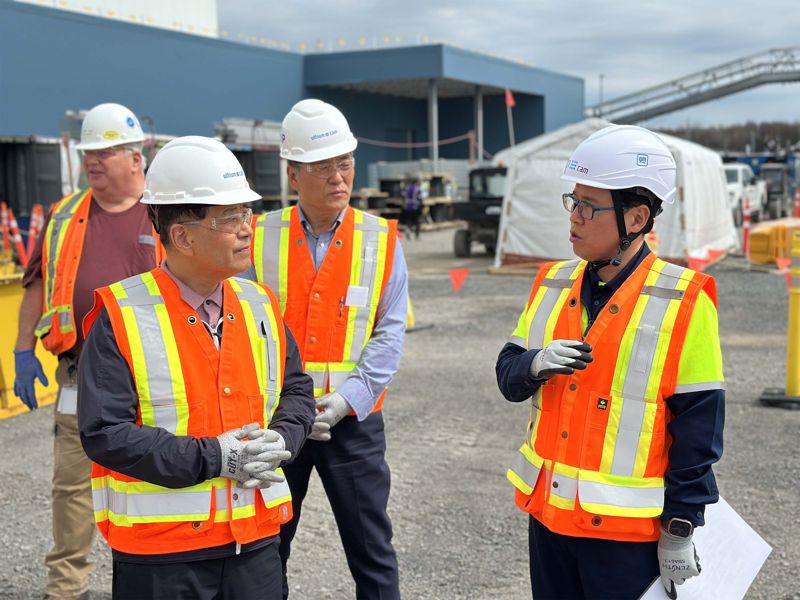 장인화 포스코그룹 회장(왼쪽)이 지난 4월 29일(현지시간) 캐나다 퀘벡에 위치한 포스코퓨처엠과 미국 제너럴모터스(GM) 합작 양극재 생산법인인 '얼티엄캠' 공사 현장을 찾아 상황을 점검하고 있다. 포스코홀딩스 제공