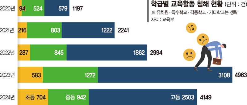 정부가 교사들의 정당한 생활지도는 보호하고, 교육활동을 방해하는 행위에 대해 대응을 강화하면서 지난해 교육활동 침해건수가 2023년보다 감소한 것으로 조사됐다. 이는 지난 2023년 서울 서이초 교사 자살 사건 이후 학교 현장의 교육활동 침해에 대한 민감도가 향상되고, 교권보호위원회의 개최가 의무화된 영향도 있는 것으로 보인다.