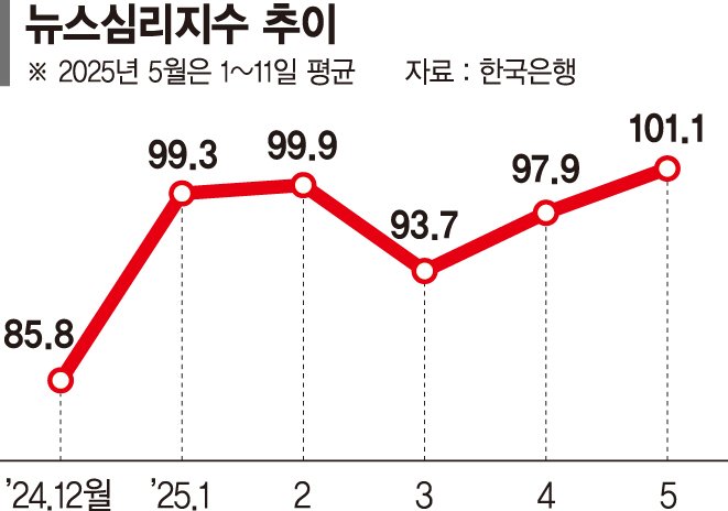 13일 한국은행 경제통계시스템에 따르면 국민 경제심리를 나타내는 뉴스심리지수(NSI)가 이달 101.1(11일 기준)로 집계됐다. 지난해 7월(106.6) 이후 10개월 만에 최고치이자 비상계엄 당시인 지난해 12월(85.8) 이후 처음으로 기준선(100)을 상회한 수치다.
