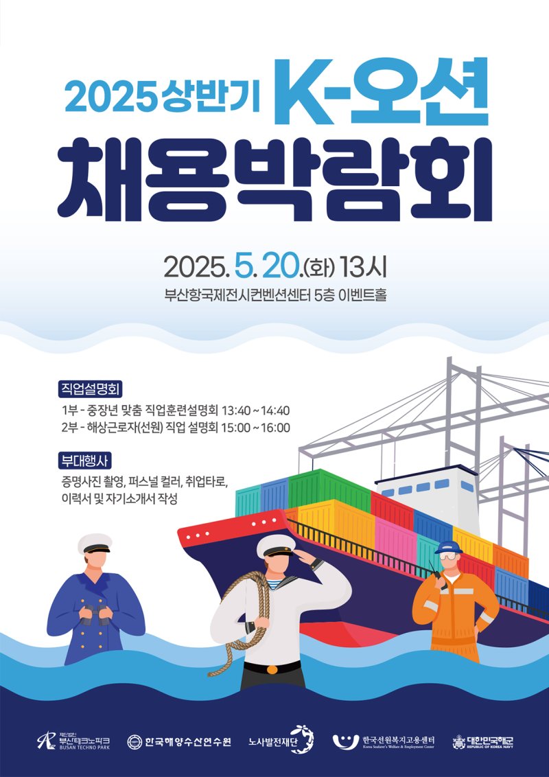 13일 부산테크노파크(TP)와 한국해양수산연수원에 따르면 이들은 한국선원복지고용센터, 노사발전재단, 대한민국 해군본부와 협업해 이번 K-오션 채용박람회를 공동 개최한다.