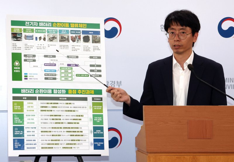 배터리 순환이용 활성화 방안 설명 (세종=연합뉴스) 배재만 기자 = 환경부 배정한 이차전지순환이용지원단 부단장이 지난 13일 정부세종청사 환경부 기자실에서 배터리 순환이용 활성화 방안에 관해 설명하고 있다. 2025.5.14 scoop@yna.co.kr (끝)