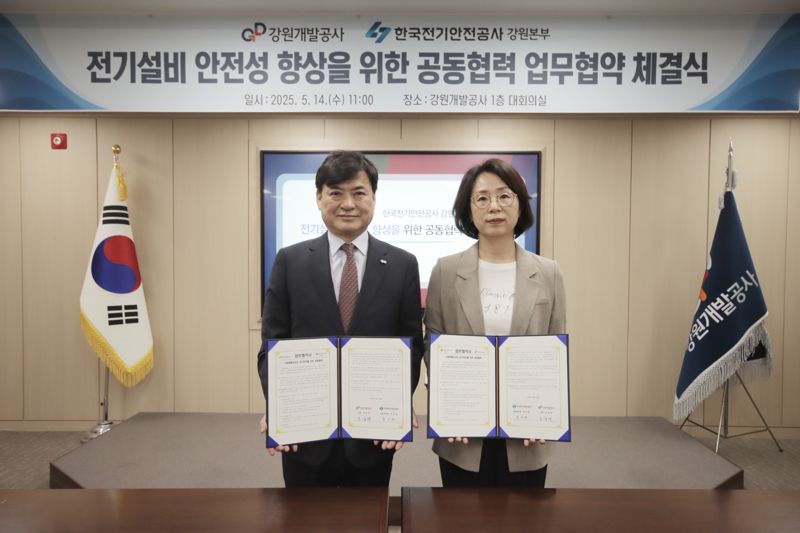 【파이낸셜뉴스 춘천=김기섭 기자】강원개발공사는 14일 한국전기안전공사 강원지역본부와 전기안전 강화를 위한 업무협약을 체결했다.