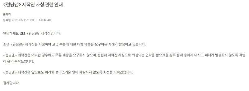 한편, 런닝맨 측은 이날 오전 공식 홈페이지에 '제작진 사칭 관련 안내'라는 제목의 공지문을 통해 "최근 제작진을 사칭해 고급 주류에 대한 대량 배송을 요구하는 사례가 발생하고 있다"며 "사칭으로 의심되는 연락을 받으셨을 경우 절대 응하지 마시고 피해가 발생하지 않도록 각별히 유의 부탁드린다"고 당부했다.