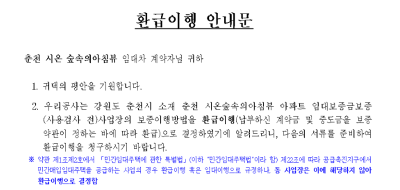 16일 주택도시보증공사(HUG)에 따르면 HUG는 홈페이지에 지난 14일 ‘춘천 시온숲속의 아침뷰 환급이행 안내문’을 내걸고 환급이행을 청구할 것을 공지했다.