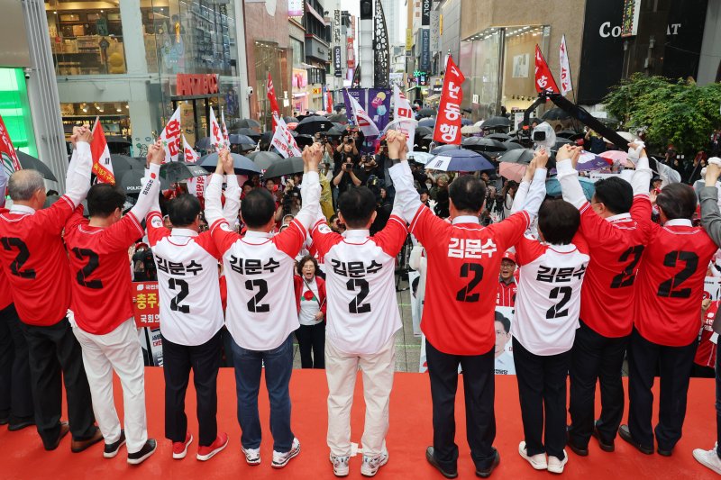 김문수 국민의힘 대통령 후보가 16일 오후 충북 청주시 상당구 성안길에서 가진 유세에서 의원들과 함께 손을 맞잡아 들어보이고 있다. 뉴스1