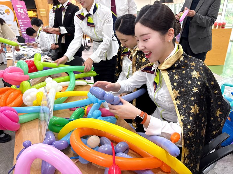 진에어 Delight JINI 이벤트 특화팀 객실 승무원들이 지난 16일 넥슨어린이재활병원에서 어린이들을 위한 재능 기부 활동을 준비하고 있다. 진에어 제공