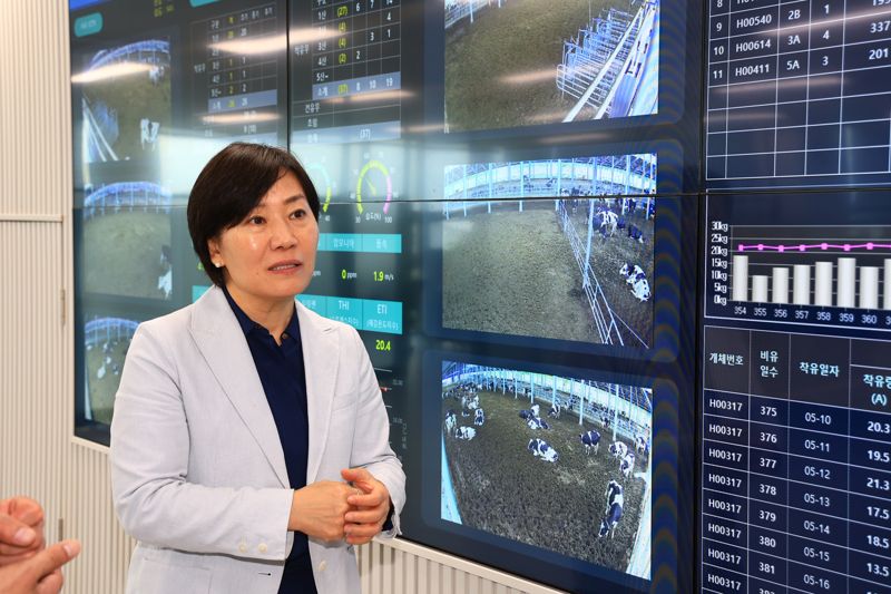 19일 충남 당진시 고대면에 위치한 스마트축산단지에서 농림축산식품부 송미령 장관이 현장점검을 하고 있다. 농식품부