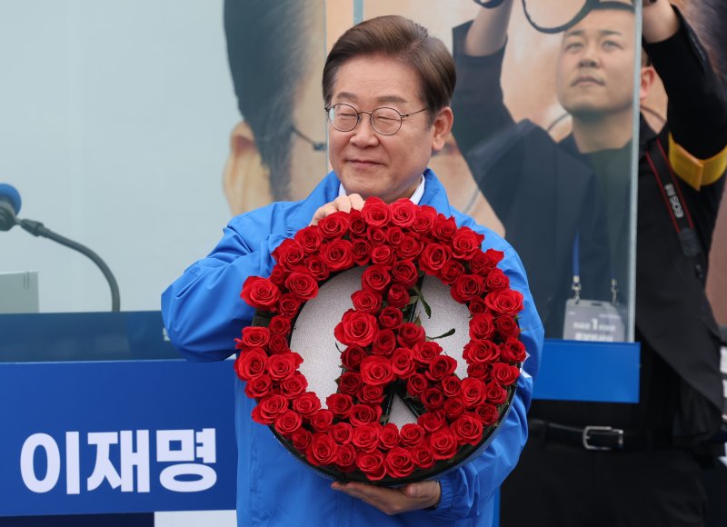 (서울=뉴스1) 안은나 기자 = 이재명 더불어민주당 대통령 후보가 수도권 표심잡기에 나선 20일 오후 경기 고양시 일산문화광장에서 열린 유세에서 장미꽃으로 만든 투표기호를 들어보이고 있다. (공동취재) 2025.5.20/뉴스1 /사진=뉴스1화상