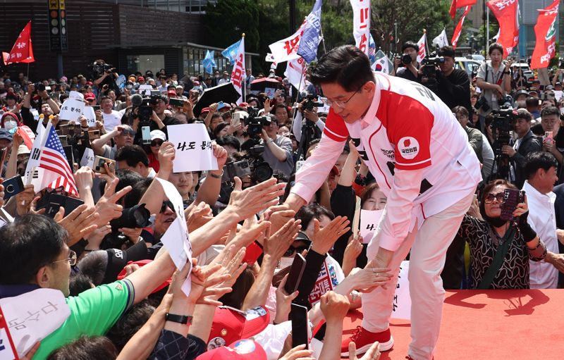 김문수 국민의힘 대선후보가 20일 서울 서초구 고속터미널 앞 광장에서 지지자들과 악수하고 있다. 사진=박범준 기자
