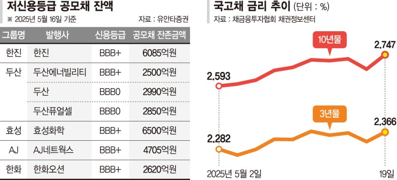 두산그룹의 경우, BBB급 신용도로 공모채를 발행한 계열사가 두산에너빌리티(BBB+), 두산(BBB0), 두산퓨얼셀(BBB0)로 세 곳이나 됐다. 이들 세 개 계열사의 공모채 잔액은 총 8000억원이 넘어갔다. 또 효성화학(BBB+)의 공모채 잔액이 6500억원, 한진(BBB+)의 공모채 잔액이 6085억원으로 여타 기업 대비 비교적 상당한 편이라고 지적했다.
