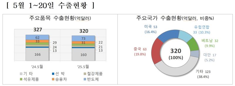 21일 관세청이 잠정 집계한 5월 1~20일 수출입 현황에 따르면 수출은 320억달러로 지난해 같은 기간보다 2.4% 감소했다. 일평균 수출액은 25억6000만달러로 2.4% 감소했다. 이 기간 조업일수는 12.5일로 지난해와 같았다. 수입은 2.5% 줄어든 322억달러로 무역수지는 3억달러 적자를 냈다.