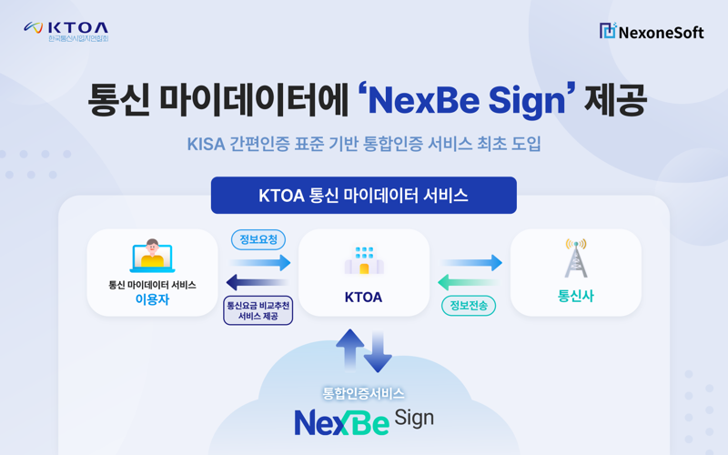 넥스원소프트가 한국통신사업자연합회(KTOA)의 마이데이터 선도서비스 ‘통신 마이데이터’에 통합인증 서비스 ‘넥스비싸인(NexBe Sign)’을 제공했다고 21일 밝혔다.