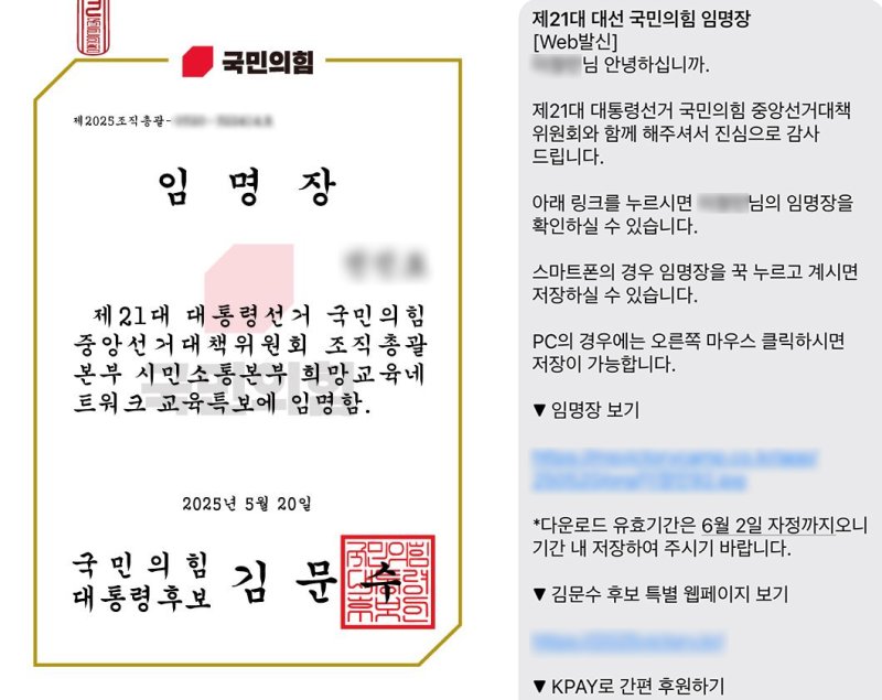 링크를 누르면 "국민의힘 중앙선거대책위원회 조직총괄본부 시민소통본부 희망교육네트워크 교육특보에 임명함. 2025년 5월 20일. 국민의힘 대통령 후보 김문수"라는 임명장이 표시된다.