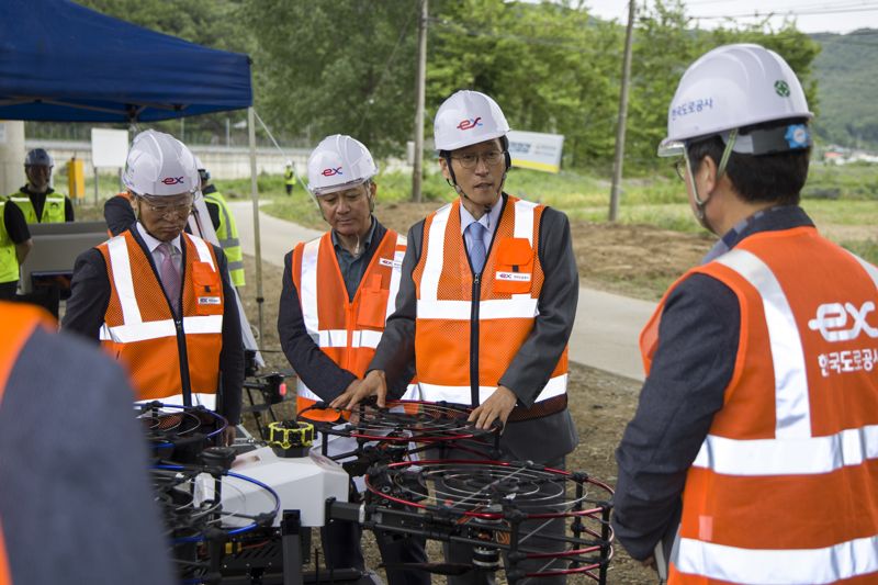 함진규 한국도로공사 사장(가운데)이 지난 22일 경북 의성군 중앙고속도로 봉양교 인근에서 자율편대비행 드론을 활용한 교량 점검을 하고 있다. 공사 제공