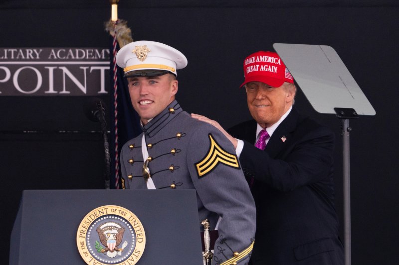 도널드 트럼프 대통령이 24일(현지시간) 미국 뉴욕 웨스트포인트에서 열린 미 육군사관학교 졸업식에서 육군 블랙나이츠의 미식축구 쿼터백인 졸업생 브라이슨 데일리의 등을 두드리며 격려하고 있다. AP 뉴시스