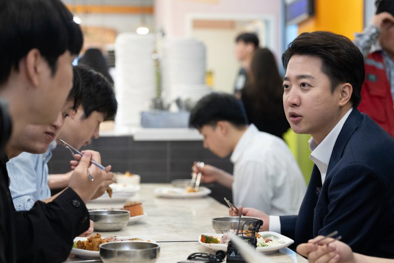 이준석 개혁신당 대통령 후보가 지난 24일 서울 동작구 노량진의 한 한식 뷔페에서 식사를 하며 공시생들과 대화하고 있다. 뉴스1