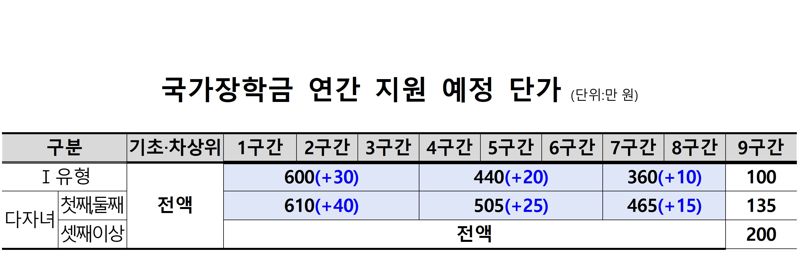 이번 인상액은 연간 지원 단가로 올 2학기에는 구간별 인상액의 절반이 적용될 예정이다. 이에따라 Ⅰ유형을 통해 1~3구간 15만원, 4~6구간 10만원, 7~8구간 5만원을 인상해 지원한다. 또 다자녀 장학금을 통해서는 1~3구간 20만원, 4~6구간 12.5만원, 7~8구간 7.5만원을 인상한다.
