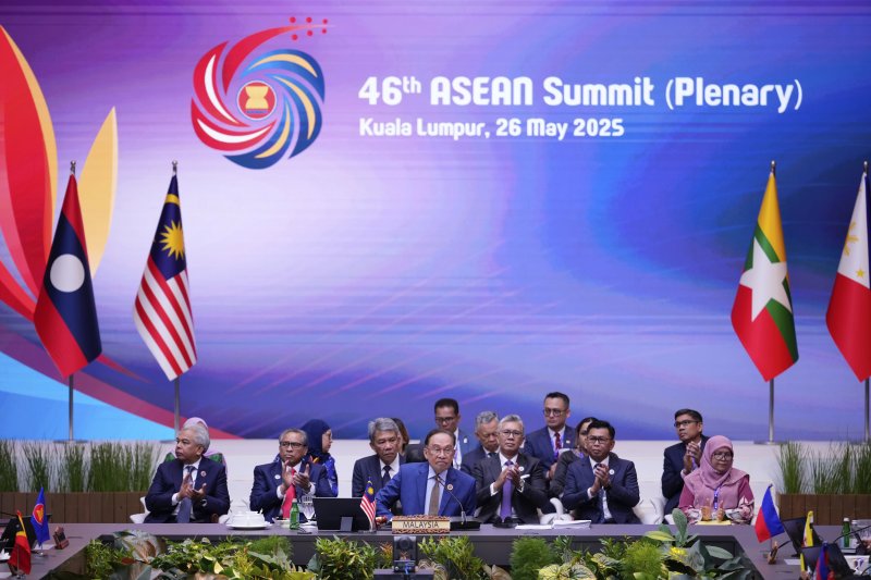 안와르 이브라힘 말레이시아 총리(가운데)가 26일 말레이시아 쿠알라룸푸르에서 개막된 동남아시아국가연합(ASEAN) 정상회의 본회의에서 회의를 주재하고 있다. 신화연합뉴스