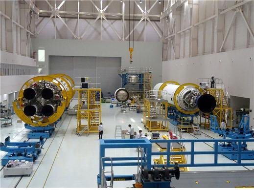 누리호 4호기 1단 조립체(왼쪽)와 2단 조립체 단조립 현장 이미지. 항공우주연구원 제공