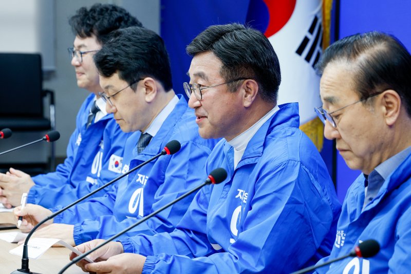 윤재옥 국민의힘 총괄선거대책본부장이 27일 오전 서울 여의도 국회에서 열린 선거대책본부 본부장단 회의에서 모두 발언을 하고 있다. 왼쪽부터 김상훈 정책총괄본부장, 윤 총괄선대본부장, 장동혁 종합상황실장, 임이자 직능총괄본부장. 사진=뉴스1