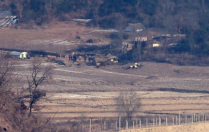 지난 12일 경기 김포시 애기봉평화생태공원 조강전망대에서 바라본 황해도 개풍군 일대 마을에 북한 주민들이 모여 있다. 뉴스1