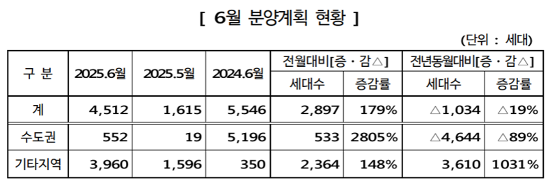 이는 전월(1615가구) 대비 179%(2897가구) 증가한 것이나, 전년 동월(5546가구) 대비 19%(1034가구) 감소한 수치다.