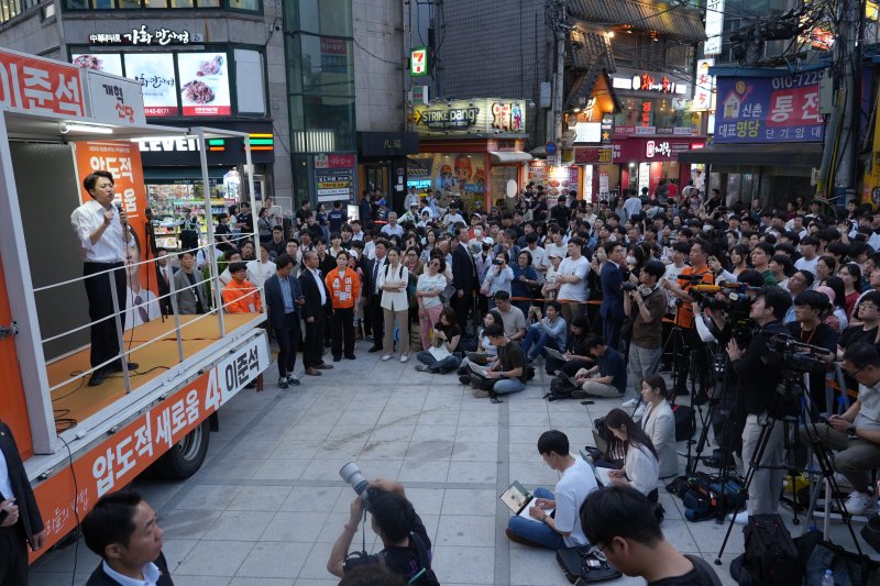개혁신당 이준석 대선후보가 30일 서울 서대문구 현대백화점 유플렉스 신촌점 앞에서 열린 집중 유세에서 시민들에게 지지를 호소하고 있다. 개혁신당 제공./사진=연합뉴스