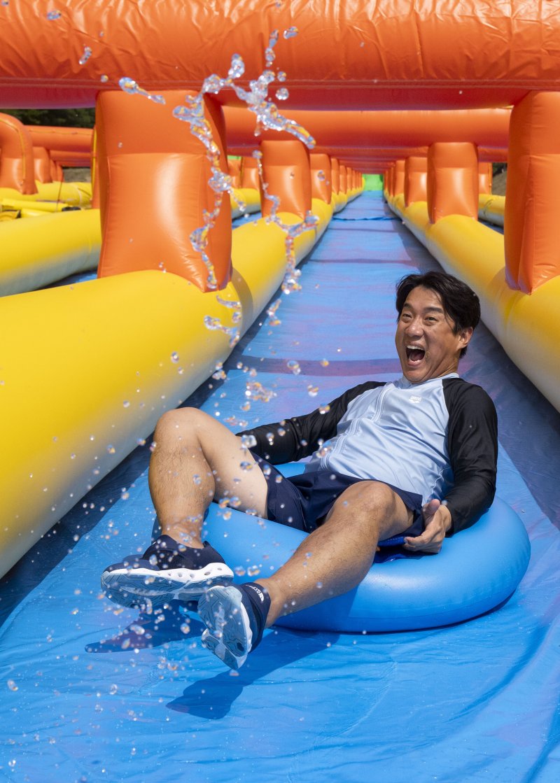 이중 스플래쉬 슬라이드는 에어바운스 형태의 초대형 튜브 슬라이드로, 물이 흘러내려가는 약 6m 높이 시작점에서 튜브에 앉아 출발하면 45도 각도로 급하강한 후 110m 길이의 슬로프를 따라 시원하게 질주할 수 있다.