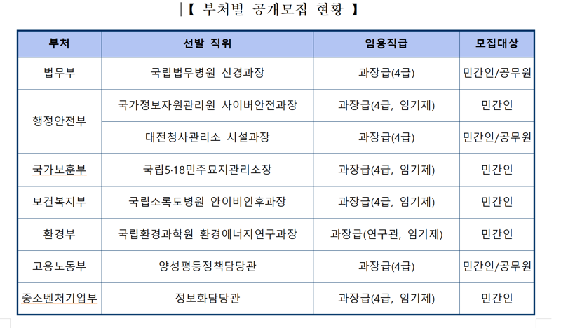 이번 공모 직위는 법무부, 행정안전부, 국가보훈부, 보건복지부, 환경부, 고용노동부, 중소벤처기업부 등 7개 부처의 과장급 8개 직위다.