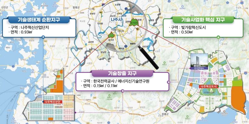전남 나주시는 과학기술정보통신부 주관 강소특구 육성 사업 2단계 지원 대상으로 선정돼 오는 2030년까지 국비 100억원 등 200억원을 들여 에너지 기술 육성에 나선다고 2일 밝혔다. 사진은 나주 강소특구 지정 구역 현황. 나주시 제공