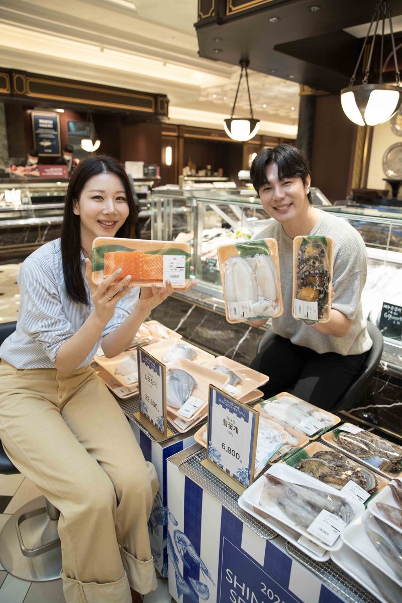2일 서울 강남구 신세계백화점 강남점 지하 1층 신세계마켓에서 모델들이 씨푸드 페스티벌 대표 제품을 홍보하고 있다. 신세계백화점 제공