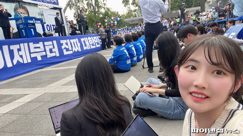 본지 홍채완 수습기자(28기)가 지난달 29일 서울 송파구 잠실종합운동장 광장에서 열린 이재명 더불어민주당 대선 후보의 집중 유세 현장을 취재하고 있다. 사진=홍채완 기자