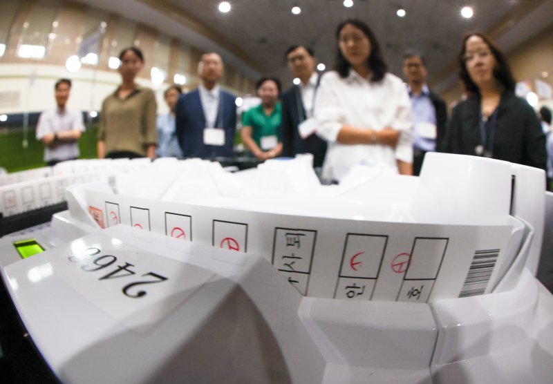 투표지 분류기 최종 점검 제21대 대선을 하루 앞둔 2일 선거관리위원회 직원들과 개표 사무원들이 서울 용산구 신광여고에 마련된 개표소에서 투표지 분류기 정상 작동 여부를 최종 모의시험하고 있다. 연합뉴스