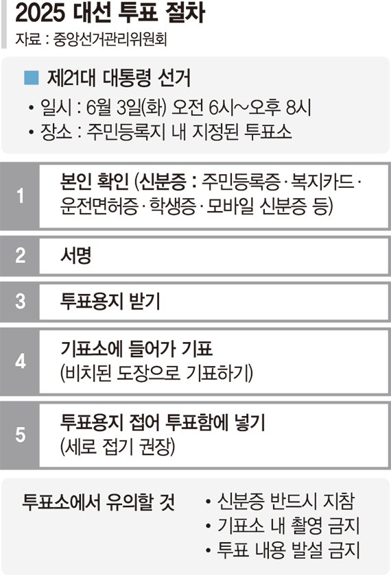 제21대 대통령을 선출하는 본투표가 3일 전국 1만4295개 투표소에서 일제히 실시된다. 투표시간은 오전 6시부터 오후 8시까지 14시간 동안 실시된다. 지난달 29~30일 실시된 사전투표가 오전 6시부터 오후 6시까지 진행된 것과 달리 2시간 더 투표가 진행된다. 이번 대선은 대통령 궐위에 따른 보궐선거로 치러지기 때문에, 공직선거법에 따라 본투표 마감 시간이 오후 8시로 2시간 연장됐다. 지난 2022년 20대 대선(정상 임기만료 선거)에서는 일반 유권자 투표가 오후 6시에 끝났지만, 이번에는 보궐선거 규정이 적용된다. 대통령 탄핵으로 치러진 지난 19대 대선 때도 본투표 마감 시간은 오후 8시였다.