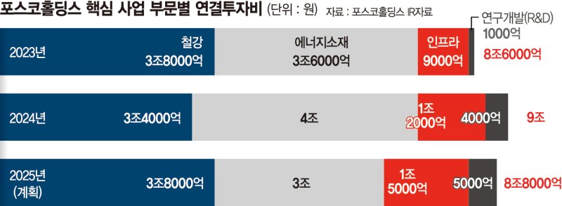 포스코홀딩스가 경기 둔화에도 올해 8조8000억원을 투자해 철강·인프라 사업 경쟁력 강화에 나선다. 에너지소재 투자액은 줄였지만, 철강과 인프라에는 각각 2000억원·3000억원을 증액해 본업 중심의 선제적 체질 개선에 속도를 낸다는 전략이다.