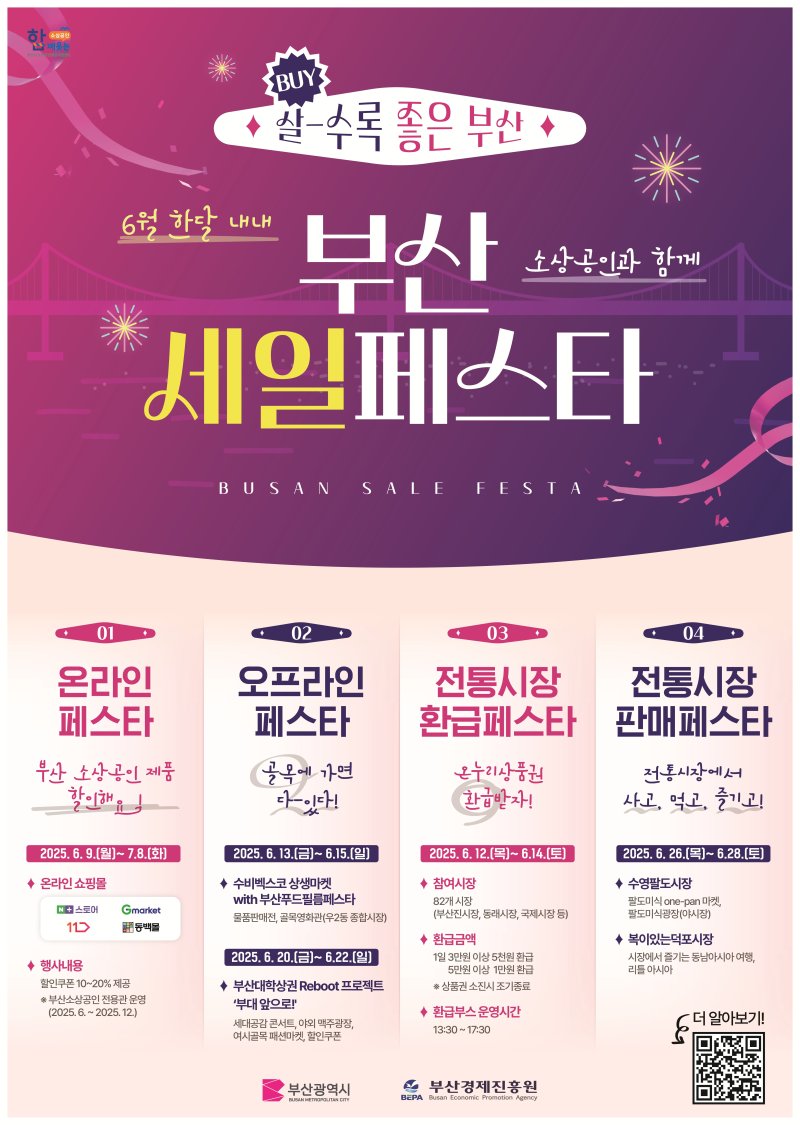 박형준 시장은 "이번 부산세일페스타가 지역 상권과 전통시장에 새로운 활력을 불어넣는 계기가 되길 바란다"면서 "앞으로도 지역 소비를 촉진할 수 있는 다양한 정책을 계속해서 추진하겠다”라고 밝혔다.