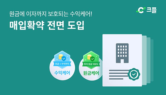 크플은 지난 2018년 7월 아담투 상품 출시와 함께 매입확약 운영을 시작한 이래, 매입확약이 적용되는 상품의 범위, 원금 보호 조건을 지속적으로 확대하기 위해 노력해왔다. 이달부터는 PFCT가 취급하는 거의 모든 아담투 상품에 매입확약 조건이 적용된다. 투자금 보호 범위 기준도 강화됐다. 최소 원금의 95%, 원금 100%, 기본 수익, 그리고 최대로는 연체이자까지 케어되는 총 4가지로 구성된다. 특히 개별 상품에 '수익 케어' 상품 태그가 붙는 상품의 경우 기존과 달리 최대 60일치의 정상 및 연체 이자까지 보호된다.
