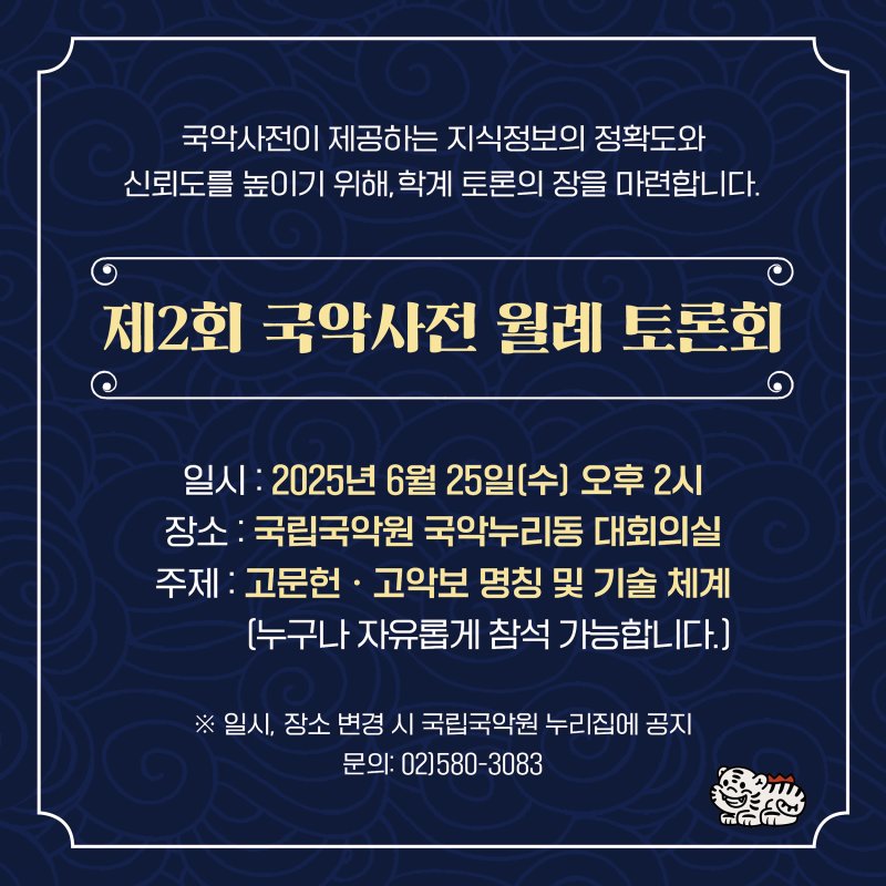이번 '제2회 국악사전 월례 토론회'는 오는 25일 오후 2시, 국립국악원 국악누리동 대회의실에서 개최하며 관심있는 사람은 누구나 참여할 수 있다. 향후 토론회 일정은 국립국악원 누리집 및 국악사전 누리집에서 확인할 수 있다.