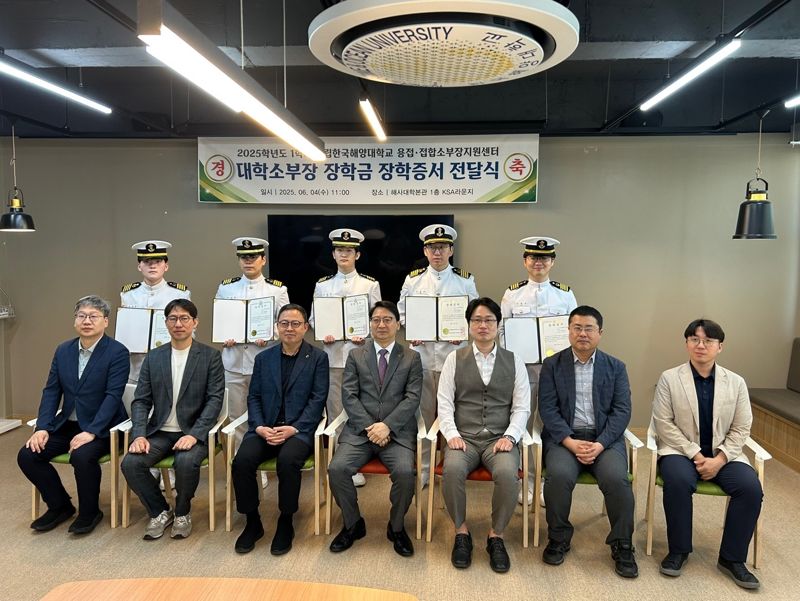 지난 4일 국립한국해양대 해사대학 KSA라운지에서 열린 장학증서 전달식에서 해사대학 김종수 학장(앞줄 왼쪽 세번째) 등이 장학생들과 기념사진을 촬영하고 있다. 한국해양대 제공