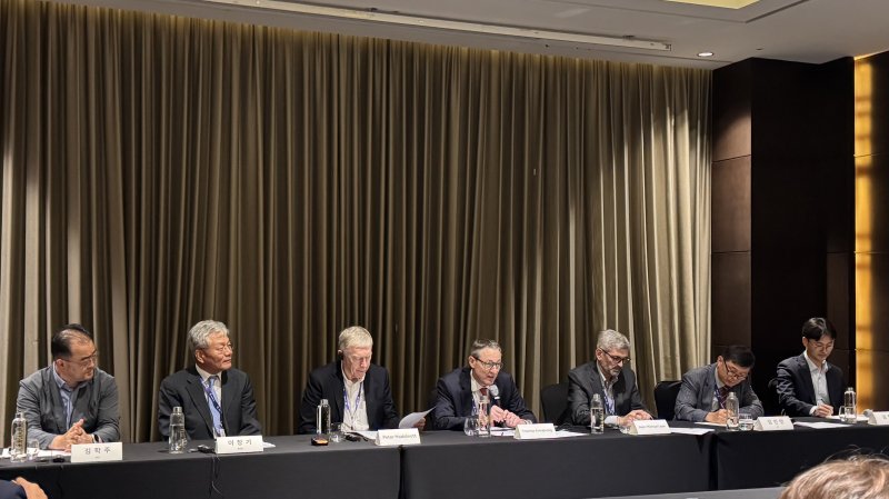 김학주 한국에너지기술연구원 박사(왼쪽부터), 이창기 한국시멘트협회 부회장, 피터 호디노트 전 유럽시멘트협회장, 토마스 암스트롱 셈넷 회장, 장 미셸 삼표산업 전무, 김진만 공주대 교수, 김진효 법무법인 태평양 변호사가 10일 서울 여의도 콘래드호텔에서 열린 '셈텍 아시아 2025' 특별세션에 참여하고 있다. 사진=신지민 기자
