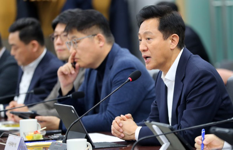 오세훈 서울시장이 지난 2월 13일 오후 서울 중구 서울시청에서 열린 서울시 투자출연기관 규제철폐 및 AI대상 사업 발굴 보고회에서 인사말을 하고 있다. 뉴시스