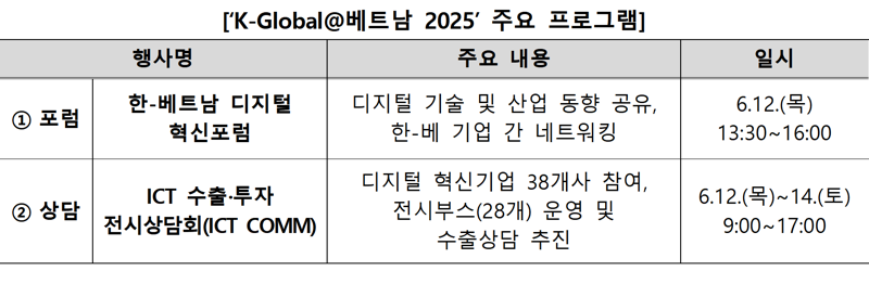 이번 베트남 일정은 과기정통부의 대표적인 국내 정보통신기술(ICT) 스타트업 해외 진출 지원 정책 브랜드 ‘K-Global’ 참여기업들이 현지에서 자사 홍보와 수출 상담 등을 진행하는 연례행사인 ‘K-Global@베트남’으로, 올해는 호치민에서 열리는 베트남 최대 ICT 국제 전시회 ‘ICT COMM’과 연계해 추진된다.